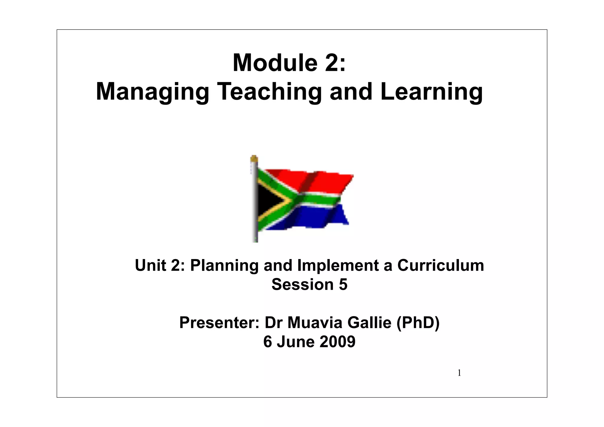 This document provides an overview of curriculum planning and implementation in South Africa. It discusses key concepts like the National Curriculum Statement (NCS) which is internationally benchmarked and focuses on Africa. The NCS has 8 learning areas for grades R-9 and 29 approved subjects for grades 10-12. Assessment in the NCS includes both informal daily assessment and formal assessment. Formal assessment makes up students' grades and is used for promotion and certification requirements. Outcome-based education (OBE) principles like clarity of focus, expanded opportunity, high expectations, and design down guide curriculum implementation in South Africa.