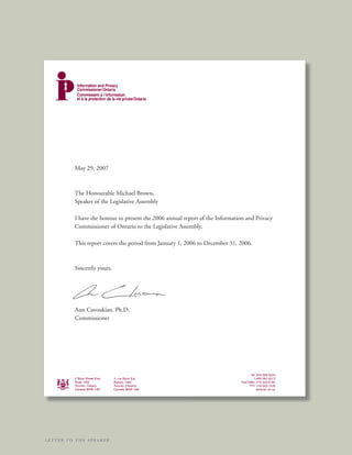 This document is the 2006 annual report of the Information and Privacy Commissioner of Ontario. It discusses key events and issues in access and privacy from 2006. Some highlights include the introduction of Right to Know Week to promote freedom of information, support growing for the Privacy-Embedded 7 Laws of Identity, acceptance of the Global Privacy Standard at an international conference, and new court rulings affirming the Commissioner's investigative powers. It also outlines partnerships and educational materials produced by the Commissioner's office on topics like social media privacy, identity management, and RFID systems.