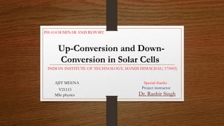 This document discusses the processes of up-conversion (UC) and down-conversion (DC) in solar cells to enhance efficiency and reduce energy loss. It explains the working mechanisms of both processes, materials used, and their significance in improving solar cell performance. The document also highlights the potential efficiency improvements achievable through these technologies.