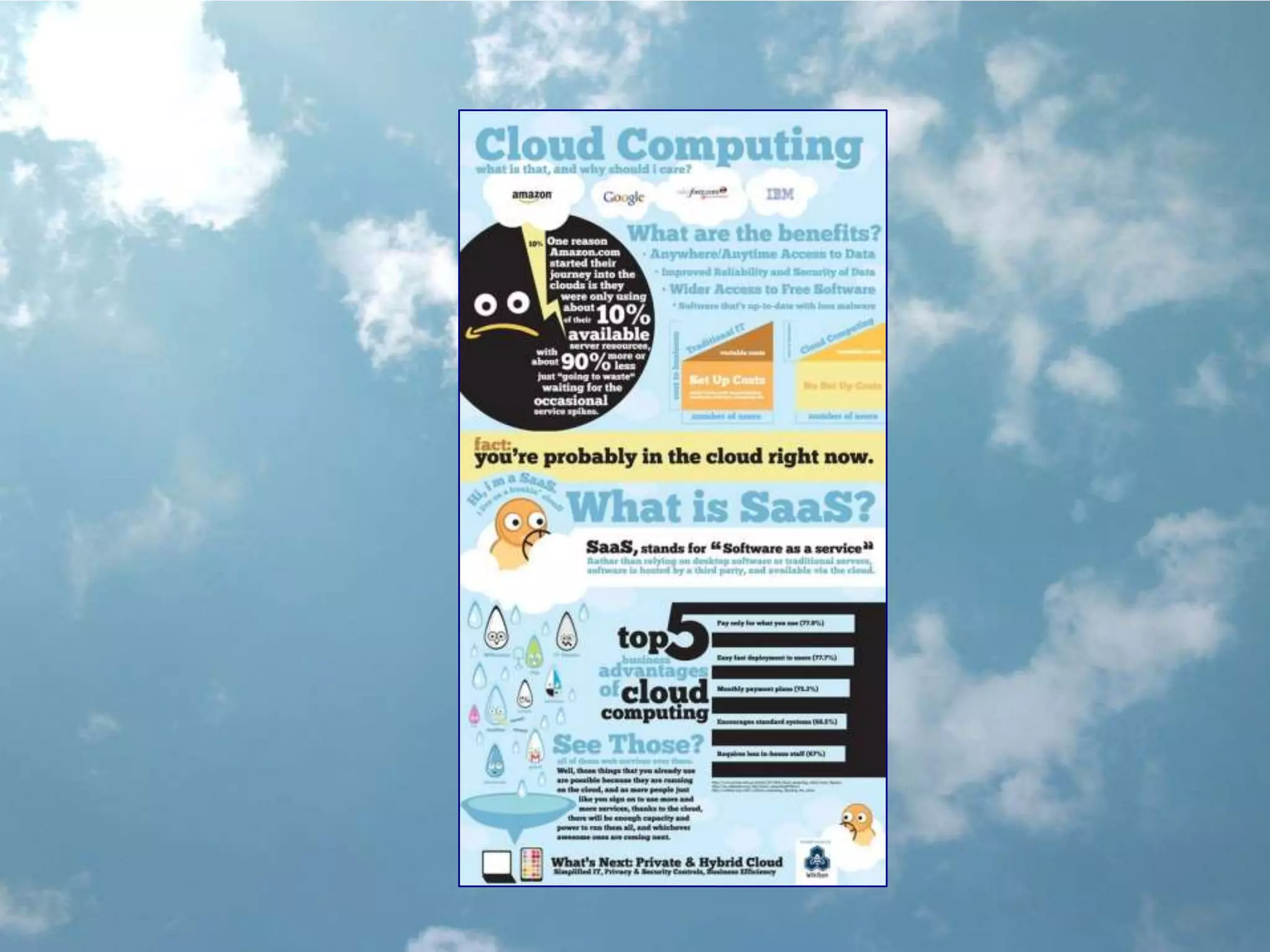 The document discusses cloud computing and its applications for libraries. It begins by explaining what cloud computing is and some of its key benefits like flexibility, cost effectiveness, and accessibility from any device. It then outlines different types of cloud models including private, public, hybrid, and community clouds. The document notes advantages of cloud computing for consumers, small businesses, and large companies. Potential concerns around reliability, security, privacy, and unpredictable costs are also presented. Finally, it discusses how cloud computing represents a more efficient model than local servers for libraries and provides some examples of cloud services that could be used.