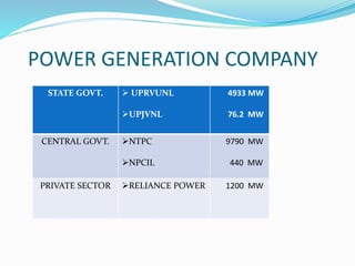 This document provides information about power generation and distribution in Uttar Pradesh. It details the installed capacity of various power plants in the state run by entities like UPRVUNL, NTPC, and private operators. It also lists upcoming power projects. Distribution is handled by four state-owned discoms and two private discoms. The document performs SWOT analyses of the generation and distribution sectors and describes the UDAY scheme aimed at improving discom efficiency. Overall, it comprehensively outlines the power infrastructure and key entities involved in the sector in Uttar Pradesh.