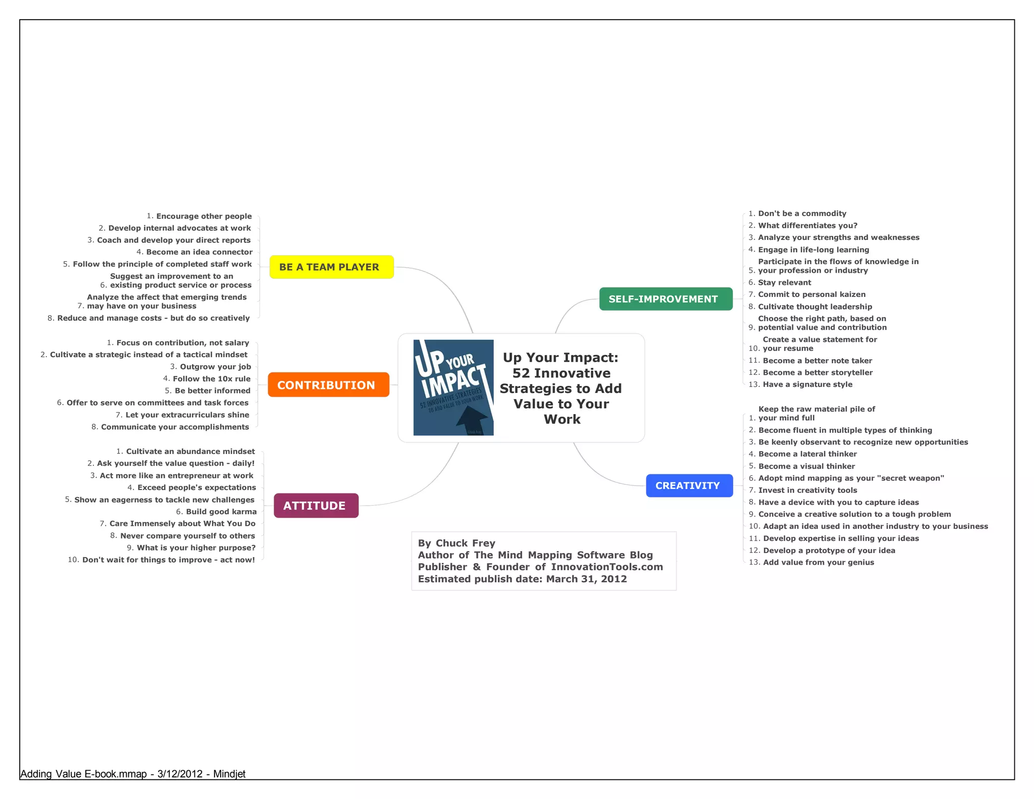The document provides 52 strategies for adding value to one's work across 13 categories: be a team player, self-improvement, contribution, attitude, creativity. Some key strategies include developing advocates at work, coaching direct reports, engaging in lifelong learning, focusing on contribution over salary, cultivating a strategic mindset, offering to serve on committees, and conceiving creative solutions to tough problems.