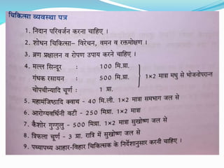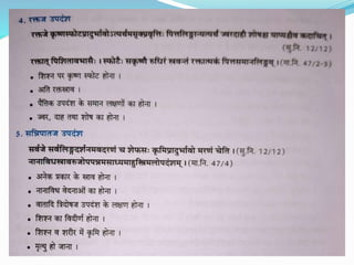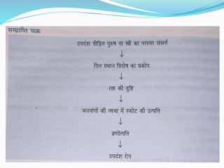 Upadamsa is an Ayurvedic condition characterized by painful genital ulcers. It is caused by vitiation of the doshas, especially pitta, from factors like excessive sexual intercourse. The doshas then produce inflammation and ulceration on the genitals. Upadamsa presents as tender papules that become pustular and erode into painful ulcers, which may merge. Treatment focuses on cleansing and healing the ulcers through topical applications and oral medications aimed at pacifying the aggravated doshas.