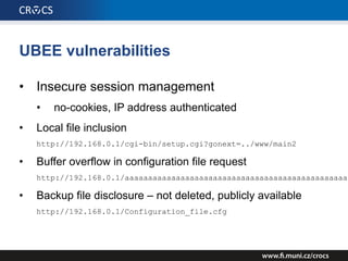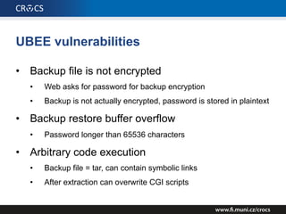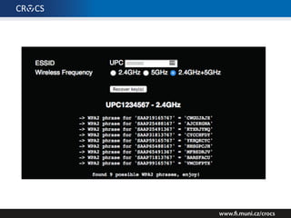 The document details a comprehensive analysis of vulnerabilities found in UPC router firmware, particularly focusing on the process of reverse engineering to extract WPA2 password generation methods. It highlights the ease of accessing sensitive firmware data, various attack methods including brute force and command injection, and outlines the discovery of numerous security flaws across different router models with statistical analyses of affected networks. The timeline of the research project and its disclosure to Liberty Global are also documented.