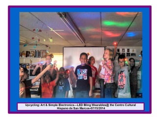 This document announces a makerspace event at Artspace focusing on upcycling, art, and simple electronics. The event will include creating digital bling wearables and simple circuits. A makerspace is defined as a place for hands-on creative activities using new technologies and basic tools. The event will cover elements of art like line, form, movement, balance, and principles of design like symmetry. Related artists who have made Rube Goldberg-like machines will also be discussed. Participants will then gather supplies to start designing and making their own projects.