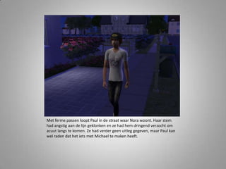 Met ferme passenloopt Paul in de straat waar Nora woont. Haar stem had angstig aan de lijn geklonken en ze had hem dringend verzocht om acuut langs te komen. Ze had verder geen uitleg gegeven, maar Paul kan wel raden dat het iets met Michael te maken heeft.