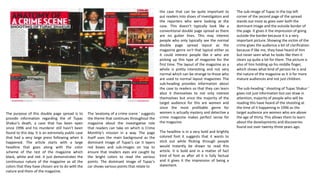 The document analyzes and summarizes two magazines - Crime Monthly, a true crime magazine, and Weir & Sons STYLE magazine, a luxury fashion magazine. It discusses the target audiences, purposes, and design elements of each magazine cover and selected inside pages. While the magazines have different genres and styles, they both adhere to some conventions of their types. Crime Monthly has a busy layout typical of children's magazines, while Weir & Sons STYLE magazine presents an elegant, refined style for a wealthy audience. Reading digital magazines can be less accessible and tiresome compared to print.