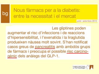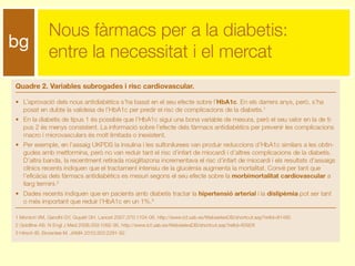 L’aprovació de nousantidiabètics es basa en efecte sobre HbA1c Els nous antidiabètics orals disminueixen l’HbA1c en 1% En els recents assaigs clínics sobre tractament intensiu de la diabetes, aquest va disminuir l’HbA1c en 1% Què hem après amb la rosiglitazona? Que l’HbA1c és una variable subrogada inadequada com a indicador d’efecte terapèutic en la diabetes de tipus 2