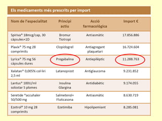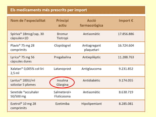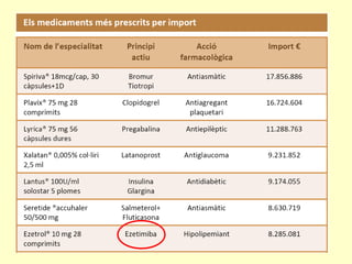 Mesures d’aplicació iefectes immediats Substitucions centralitzades de medicaments per la versió més barata amb el mateix fàrmac Substitucions (pels prescriptors) per altres fàrmacs equivalents terapèutics Increment d’incentius a la prescripció raonada