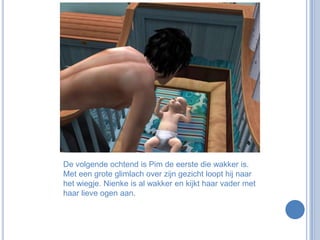 De volgende ochtendis Pim de eerste die wakker is. Met een grote glimlach over zijn gezicht loopt hij naar het wiegje. Nienke is al wakker en kijkt haar vader met haar lieve ogen aan.