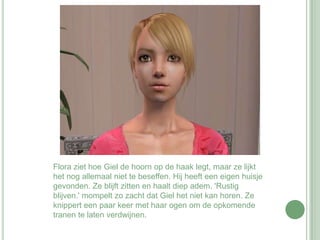 Flora kijkt uithet raam. De sterren aan de hemel blinken en ze zucht, twee van die sterren zijn haar ouders. Ze zucht en pinkt een traan uit haar ooghoek weg. Ze baalt ervan dat ze Giel haar ware gevoelens voor hem niet durft te vertellen. Maar ze weet ook niet wat ze moet doen als ze het hem wel verteld.