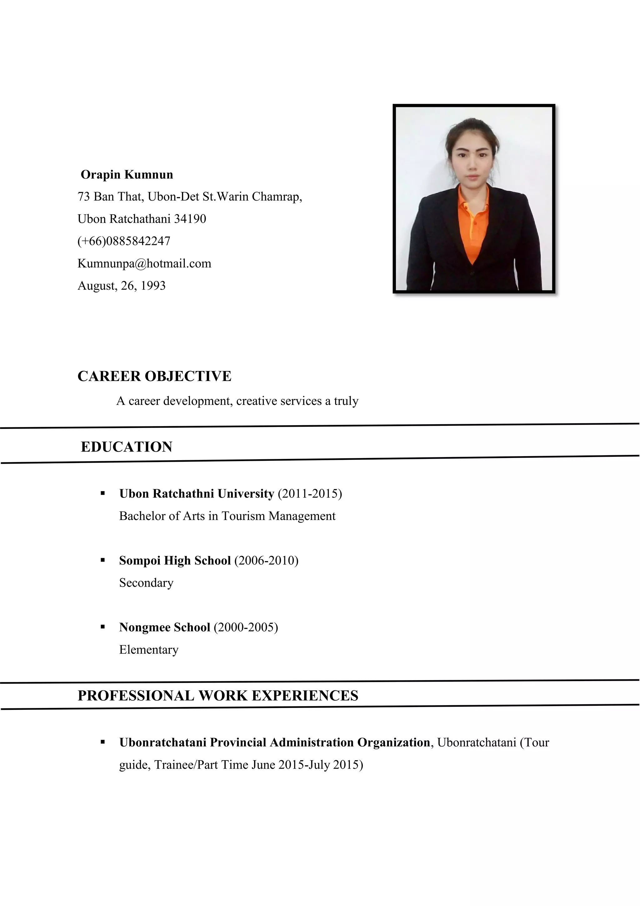 This document is a resume for Orapin Kumnun. It includes her contact information, career objective, education history, professional work experiences as a tour guide and trainee in food and beverage, skills in customer service, teamwork, communication and Microsoft Office, interests in volleyball and arts/culture, volunteer experience, a tourism research project, and three character references.