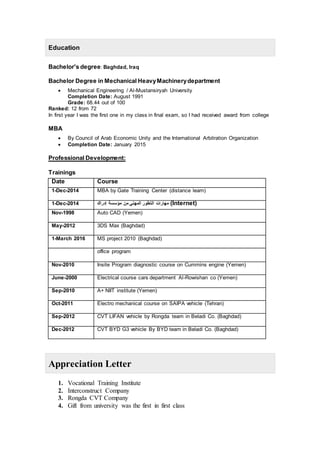 Mohammed Aljaboury is seeking an engineering position and has 25 years of experience in fields including construction, customer service, automotive, and oil/gas. He holds a Bachelor's degree in Mechanical Engineering and an MBA. His most recent role was as Chief Engineer for a hospitality company in Iraq, where he oversaw maintenance programs and managed assets. Prior experience includes roles as a workshop director, heavy machine maintenance manager, site engineer, trainer, and contractor. He has skills in areas such as research, problem solving, communication, and self-development.