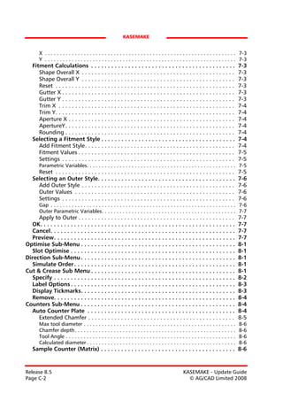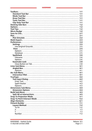 The document provides a detailed guide to the kasemake tool, including various toolbars, options, features, and settings. It outlines functionalities such as plot simulation, multi-export, layout methods, fitment calculations, and text input dialogs. The information is organized by sections, each focusing on specific tools or options available within the application.