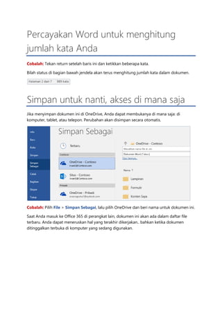 Dokumen ini adalah panduan interaktif untuk Microsoft Word yang dapat diedit, dibagikan, dan dicetak. Pengguna akan belajar tentang fitur dasar Word seperti pemeriksaan ejaan, penyimpanan di OneDrive, berbagi dokumen, serta menyisipkan dan memformat gambar. Selain itu, dokumen ini menawarkan latihan langsung untuk memahami fitur-fitur Word sambil berinteraksi dengan konten.