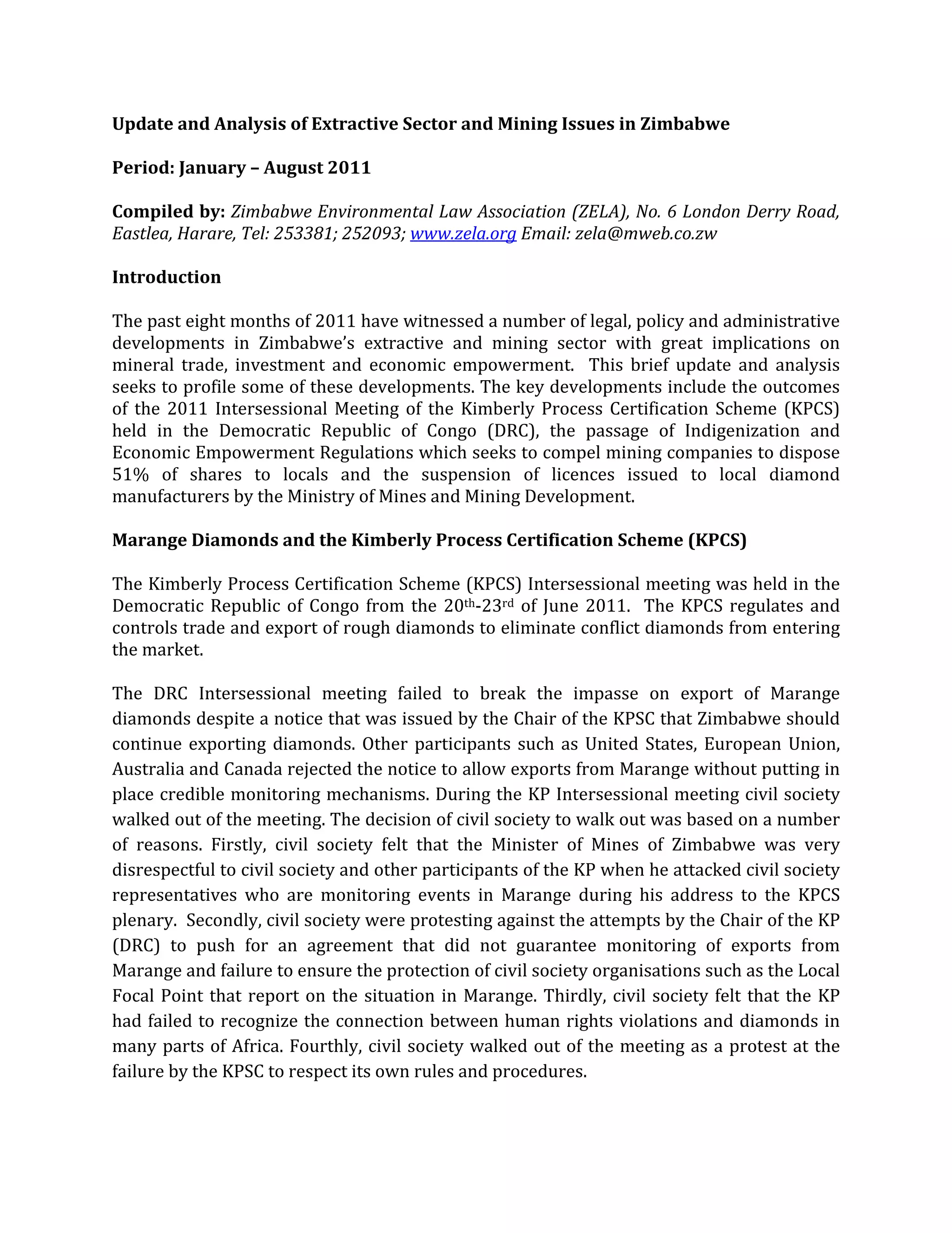 The document provides an update on developments in Zimbabwe's extractive sector from January to August 2011. Key developments include:
