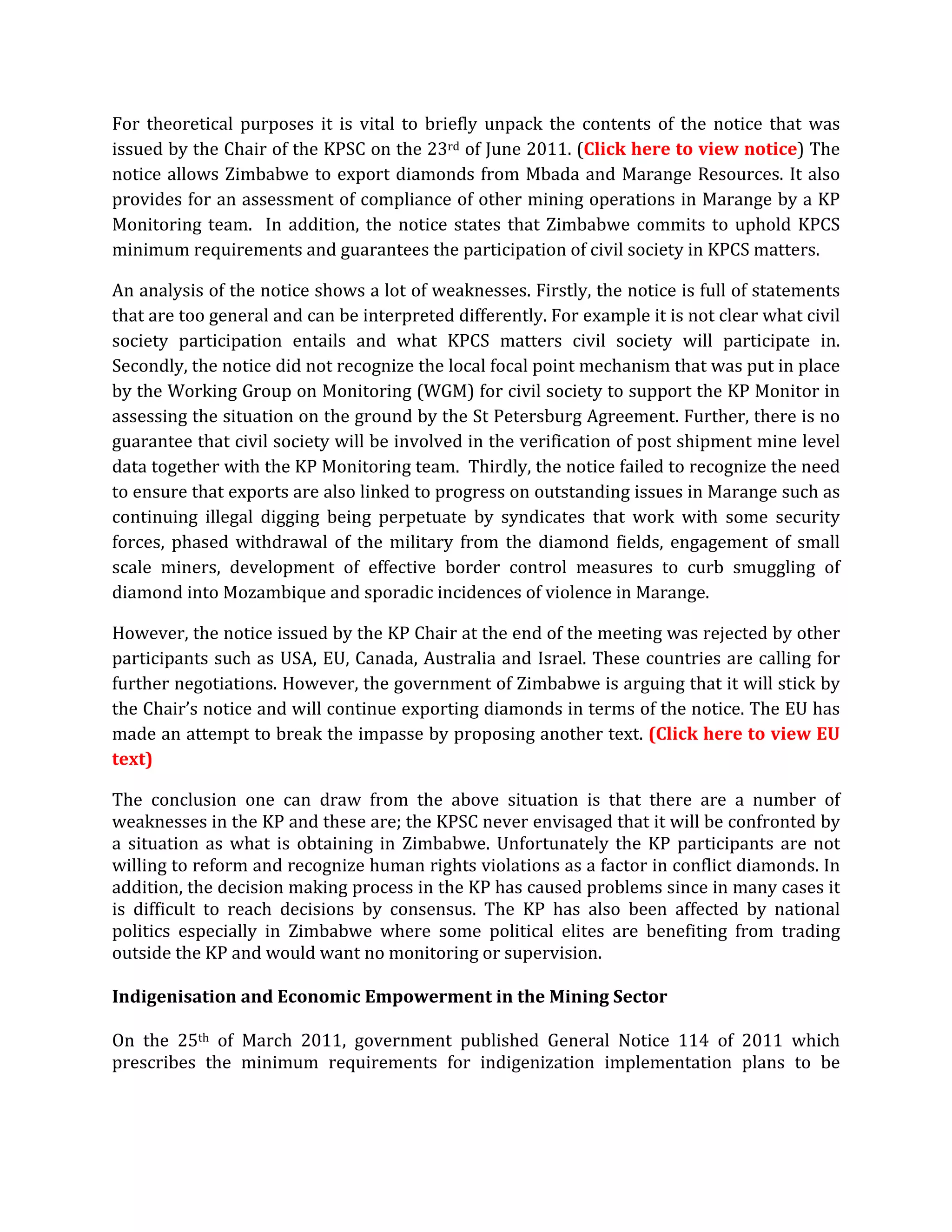 1) Zimbabwe failed to gain approval at the Kimberley Process meeting to export diamonds from Marange due to lack of monitoring mechanisms. Civil society walked out in protest over various issues.