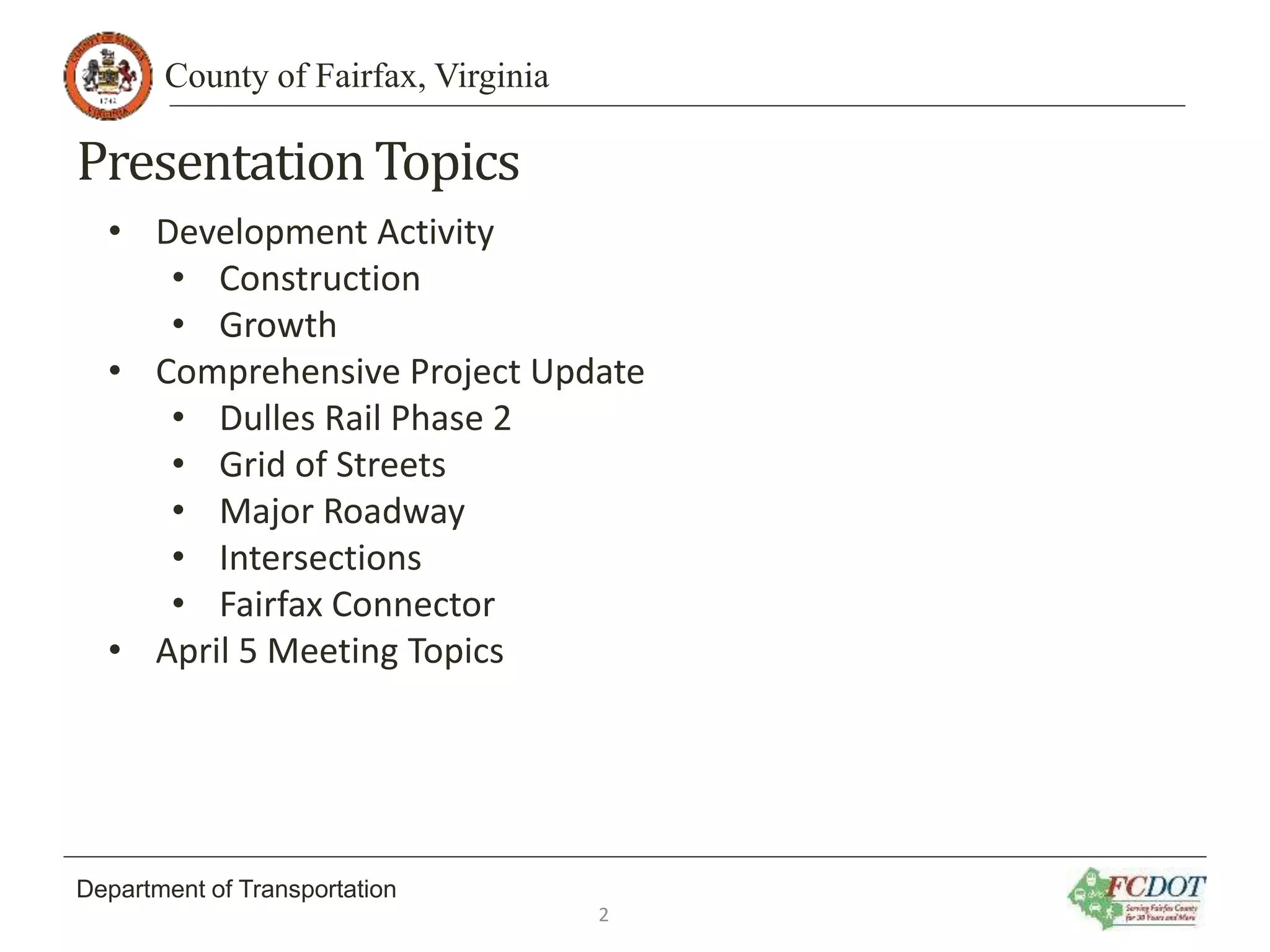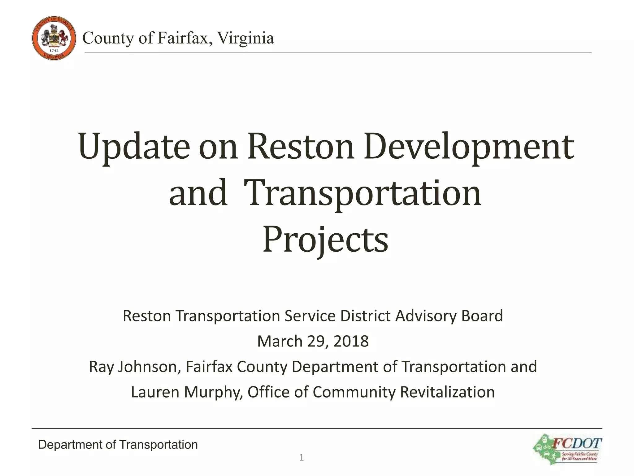 The document provides an update on development and transportation projects in Reston, Virginia from the Fairfax County Department of Transportation. It discusses major construction deliveries and current development activity, including thousands of residential units and millions of square feet of commercial space approved or under construction. It also provides status updates on numerous transportation projects to support this growth, such as the Silver Line Metro expansion, new roads, and intersection improvements.