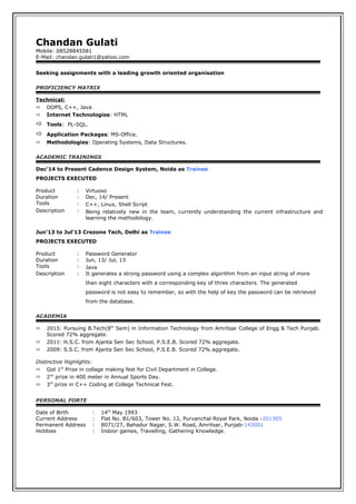 Chandan Gulati is seeking assignments with a growth-oriented organization. He has proficiency in OOPS, C++, Java, HTML, PL/SQL, MS Office, data structures, and operating systems from his academic trainings. His projects include working with C++, Linux, and shell script on the Virtuoso product and working with Java to create a password generator. He has a B.Tech in Information Technology and has won prizes for collage making, running, and C++ coding.