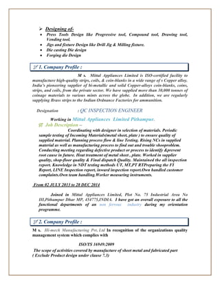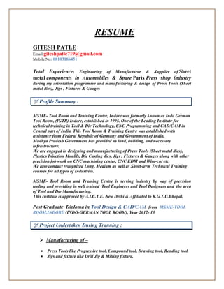 Gitesh Patle has over 10 years of experience in tool design and manufacturing of sheet metal components for the automotive and industrial machinery industries. He has worked with several companies in Central India, designing press tools and sheet metal parts in CAD software like NX and AutoCAD. Patle holds a Bachelor's degree in Mechanical Engineering and is proficient in CAD, press tool design, documentation, and machine operations. He is looking to leverage his technical and industry experience.