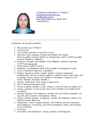 This document contains a summary of qualifications and work experience for Charmaine Rochelle F. Padilla. She has over 11 years of work experience as a respiratory therapist and technician in Saudi Arabia and the Philippines. Her experience includes working in home health care, hospitals, and providing care for patients on ventilators, oxygen therapy, and performing procedures like tracheostomy tube changes. She is licensed and certified in Saudi Arabia, the Philippines, and is BLS and ACLS certified.