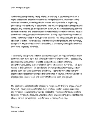 The candidate is applying for an administrative position and believes their background and skills are a strong match. They have extensive administrative experience including organizing, prioritizing, confidentiality, and report preparation. Additionally, the candidate communicates effectively, learns new skills quickly, takes initiative, and works well under pressure handling multiple tasks and deadlines. They are interested in the opportunity and available to start immediately with a negotiable salary.