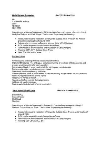 Brian Watt has over 25 years of experience as a subsea supervisor and engineer. He has worked on numerous offshore oil and gas projects in locations such as the North Sea, Africa, India, and the Americas. His responsibilities have included supervising pressure testing and installation of subsea equipment, running tools, and ensuring safety protocols are followed. He has extensive experience with subsea trees, wellheads, casing hangers, and completions.