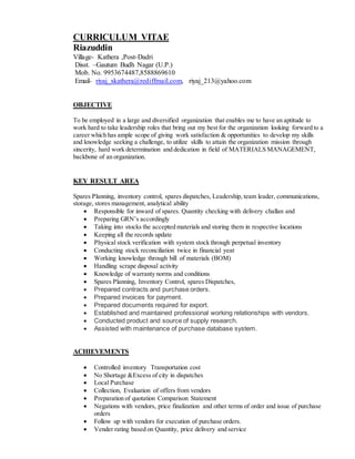 Riazuddin is seeking a position in materials management where he can utilize his skills in inventory control, spares planning, and leadership. He has over 15 years of experience in stores and inventory management roles for electronics companies. His experience includes inward goods receipt, physical verification, stock reconciliation, dispatch, and vendor management. He holds an MBA and seeks to contribute to an organization's mission through hard work and dedication.