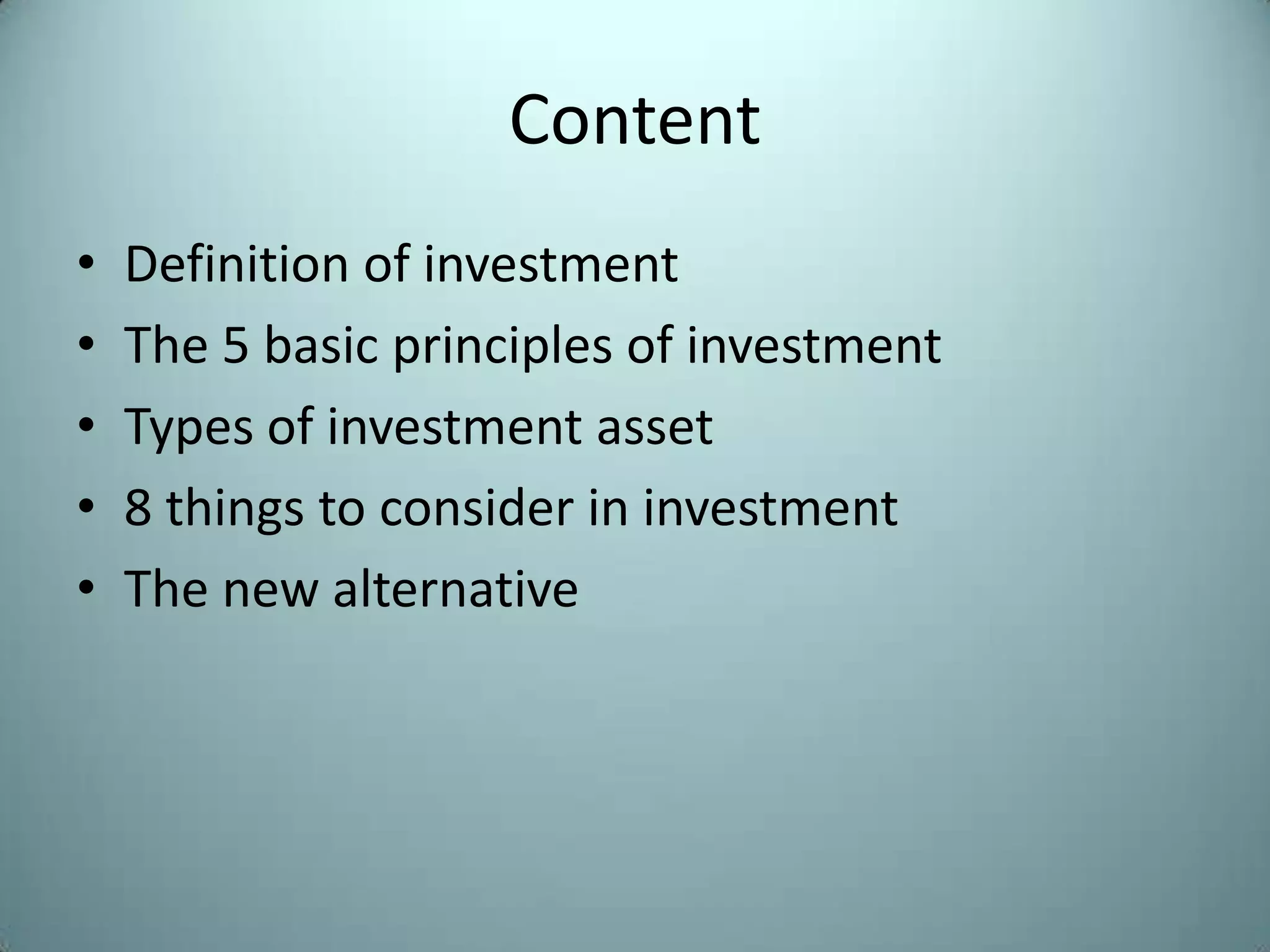This document discusses the fundamentals of investment, including definitions, principles, asset types, and considerations. It defines investment as a monetary asset purchased to generate future income or appreciation. The 5 basic principles are to diversify investments, start early to benefit from compound interest, understand that higher risk means higher potential returns, maintain investments during market slumps, and buy low and sell high. Main asset types include fixed income securities, shares, unit investment trusts, mutual funds, and property. Key considerations for investment include objectives, life stage, funds availability, risk tolerance, investment horizon, taxes, performance, and diversification. It also introduces variable universal life insurance as a new alternative investment option.