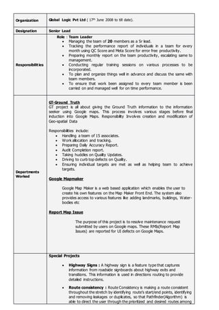 This document provides a summary of an individual seeking a challenging opportunity to enhance their skills in an organization that encourages creativity and competition. The individual has over 7 years of experience in project management and team leadership. They have a proven track record of achieving milestones and receiving awards for their work managing teams and completing projects for Google India Pvt Ltd. Their experience includes roles in mapping operations, quality management, and training.