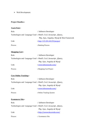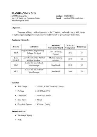 This document is a resume for M.S. Manikandan summarizing his objective, academic qualifications, skills, areas of interest, project experience, job experience, strengths, and personal details in 3 sentences or less. Manikandan seeks a challenging career in IT and has an MCA and BSc in Computer Science. He has skills in web design, databases, and programming languages. His project experience includes web development, ecommerce, and online tracking systems. He worked as a software developer from 2015-2016 using technologies like HTML, CSS, JavaScript, PHP, and databases.