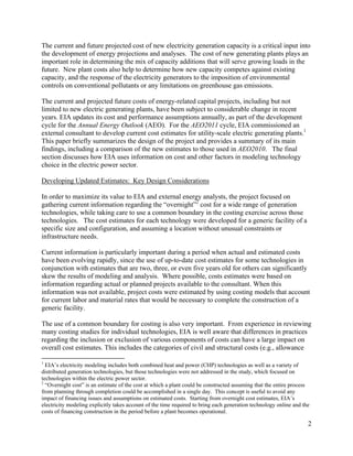 This document summarizes updated capital cost estimates for various electricity generation technologies that were commissioned by the U.S. Energy Information Administration. Key findings include that overnight capital costs for coal and nuclear plants are 25-37% higher than prior estimates, while natural gas costs remained similar. Solar photovoltaic costs declined 25% due to larger plant sizes and lower component costs. Onshore wind costs increased 21%, while offshore wind costs increased 50% to reflect first-of-a-kind U.S. project costs. Geothermal and biomass costs also increased versus prior estimates. These updated cost estimates will be used in EIA's modeling and analysis of technology choices in the electric power sector.