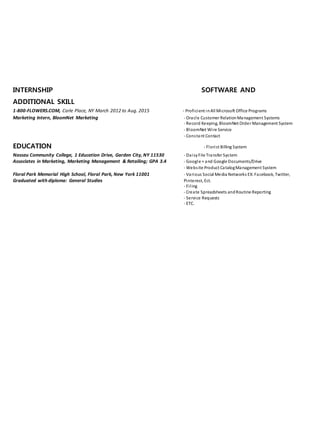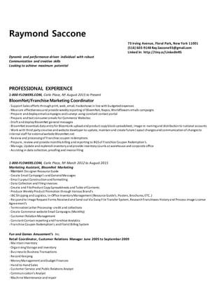 Raymond Saccone has over 10 years of experience in marketing and customer service roles. He is currently a BloomNet/Franchise Marketing Coordinator at 1-800-FLOWERS.COM where he supports sales efforts through various marketing campaigns and provides weekly reporting. Previously he was a Marketing Assistant and also worked in customer relations and retail. He has a strong background in Microsoft Office, CRM systems, and various skills relevant to the floral industry.