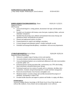 Wahid Amin Jamal Ramart is seeking registered nursing positions with over 10 years of experience as a registered nurse in the US and Ghana. He received his BSN from Chamberlain College of Nursing in 2016 and an Associate's Degree in General Nursing from Bolgatanga College of Nursing in 2008. His experience includes medical-surgical nursing at MetroWest Medical Center, home health care with Epic Health Services, and psychiatric nursing at various hospitals. He is licensed as a registered nurse in Massachusetts, New York, and Ghana.