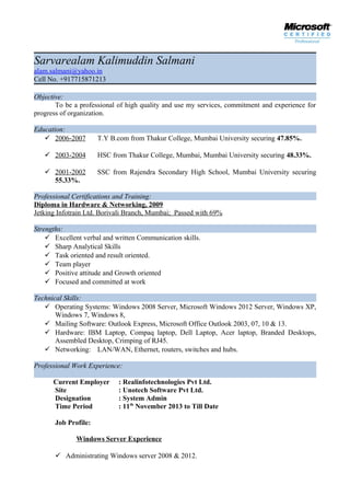 This document contains a resume for Sarvarealam Kalimuddin Salmani seeking a position as a system administrator. The summary includes: