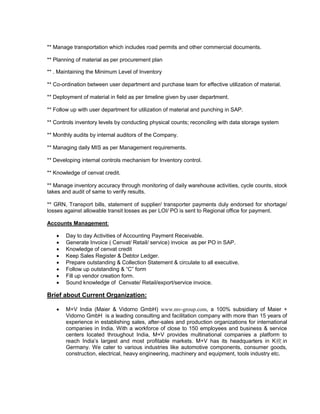 Indra Kumar Jha is seeking a position that allows him to enhance his skills and contribute to organizational growth. He has over 8 years of experience in inventory management, accounts management, and supply chain logistics. His technical skills include Tally ERP 9, MS Office, and SAP. Currently he works as an Executive Order Manager at M+V Marketing and Sales Pvt. Ltd., where he is responsible for inventory management, accounts management, and developing internal controls. Previously he worked at ENVECO as a Commercial Executive and 21 Century Legend India Pvt Ltd as a Store cum Invoicing Executive. He holds a B.Sc in IT and supply chain management training.