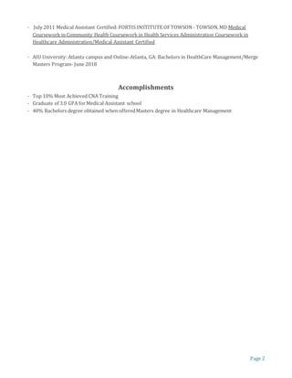 Linette Brown is a healthcare administrator seeking an internship to further her skills. She has experience in managed care, ambulatory care, and long-term care with a focus on quality assurance and claims analysis. Her skills include knowledge of Medicaid statutes and regulations, strategic planning, and quality improvement. Her work history includes roles as an insurance agent, medical assistant, and sales associate. She has a bachelor's degree in healthcare management and is pursuing a master's degree.