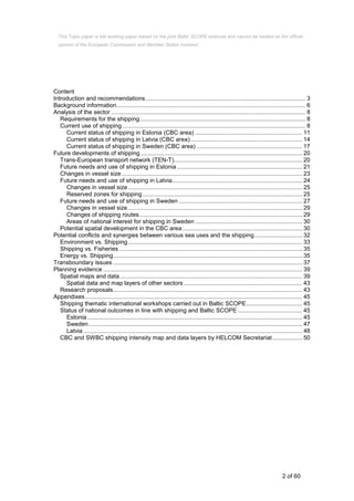 The document analyzes shipping in the Central Baltic region, including Estonia, Latvia, and Sweden. It finds that shipping is most intensive in Swedish waters passing Gotland and heading to the Gulf of Finland, and around the port of Riga. In Estonia, the ports of Pärnu and Saaremaa Harbour are highlighted as important for regional and international connections. Requirements for shipping include space for lanes and routes of various vessel types and sizes. Future developments may include changes to vessel sizes and routes. Transboundary alignment of shipping routes is recommended.