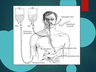 This document discusses total parenteral nutrition (TPN). It begins by outlining the indications for TPN, including malnutrition and inability to meet nutritional needs enterally. The document then covers the components of TPN including carbohydrates, amino acids, lipids, electrolytes, vitamins and minerals. It discusses the methods of administering TPN including peripherally and through central lines. The document provides guidance on calculating nutritional requirements and initiating and monitoring TPN. Finally, it reviews potential complications of TPN including mechanical issues, metabolic disturbances, and infections.