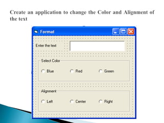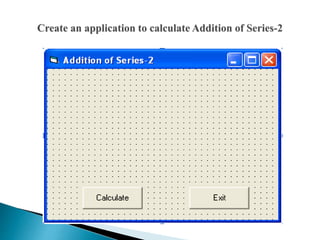 This document contains code for multiple Visual Basic programs that perform tasks like calculating averages, factorials, sums of series, displaying shapes, and formatting text properties. The code includes event handler subroutines for buttons to run calculations or clear fields, and code to perform calculations, format outputs, and set properties.