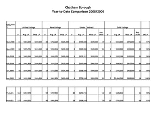 The document compares real estate market data from 2008 and 2009 for several municipalities in New Jersey. It provides statistics on active listings, new listings, properties under contract, and sold properties including average listing price, median listing price, average days on market, and sales price to list price ratio. For most areas, average and median listing prices were lower in 2009 compared to 2008, while days on market and sales price to list price ratios remained relatively steady.
