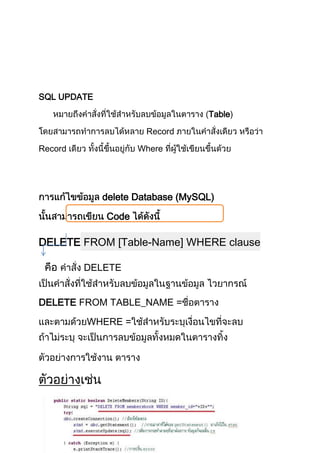 This document provides code examples for performing CRUD (create, read, update, delete) operations in a MySQL database using JSP and Java servlets. It includes SQL code examples for updating, deleting records from a table. It also includes Java code examples for a MemberDAO class with methods to get, update, delete members, and servlet classes to handle edit, update, and delete requests.