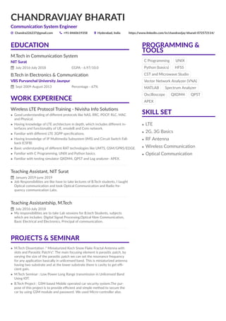 Chandravijay Bharati is a Communication System Engineer with expertise in C Programming, Python, HFSS, CST, Microwave Studio, Vector Network Analyzers, MATLAB, and Spectrum Analyzers. He has skills in LTE, 2G, 3G, RF antennas, wireless communication, and optical communication. He holds an M.Tech in Communication Systems from NIT Surat and a B.Tech in Electronics & Communication from VBS Purvanchal University Jaunpur. His work experience includes LTE protocol training and teaching assistant roles focused on optical communication, radio frequency communication, and related labs. His M.Tech dissertation involved a miniaturized Koch snowflake fractal antenna and his projects also include
