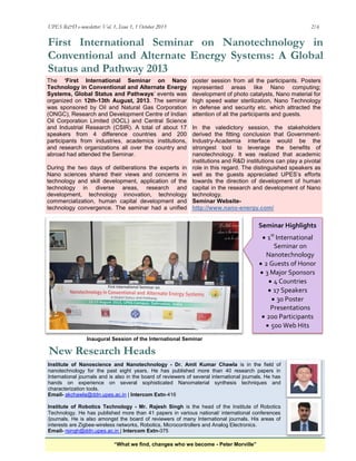The newsletter provides an update on research and development (R&D) activities at UPES university. It includes a message from the Chancellor emphasizing the importance of research in making UPES a leading innovation university. It also summarizes a recent international seminar on nanotechnology in energy systems and announces new heads of research institutes. Additionally, it lists upcoming funding opportunities, recently submitted research proposals, recent publications, and showcases a collaboration between UPES and ABB on shale gas modeling. The newsletter aims to connect, collaborate and share R&D activities and outcomes across the UPES community.