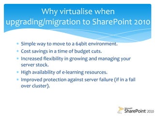 The document discusses the advantages of virtualizing during the upgrade to SharePoint 2010, emphasizing cost savings, increased server flexibility, and improved resource availability. It outlines necessary software and hardware requirements, various migration tools, and the benefits of using virtualization such as live migration and automated failover. Key players in the virtualization market and their offerings are mentioned, alongside considerations for configuring a virtual environment effectively.