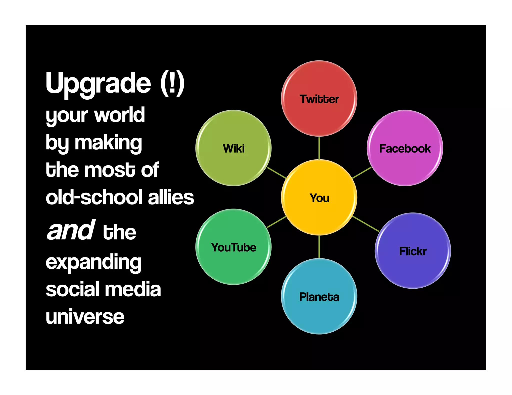 This presentation discusses how to upgrade the world by making use of both traditional and modern communication tools. It shows how environmental conservation and responsible travel messages can be shared using both high-tech and low-tech methods. The presentation encourages engagement through comments, questions, suggestions, shares, and interactions on social media. It also provides examples of different levels of engagement possible on various social media platforms.