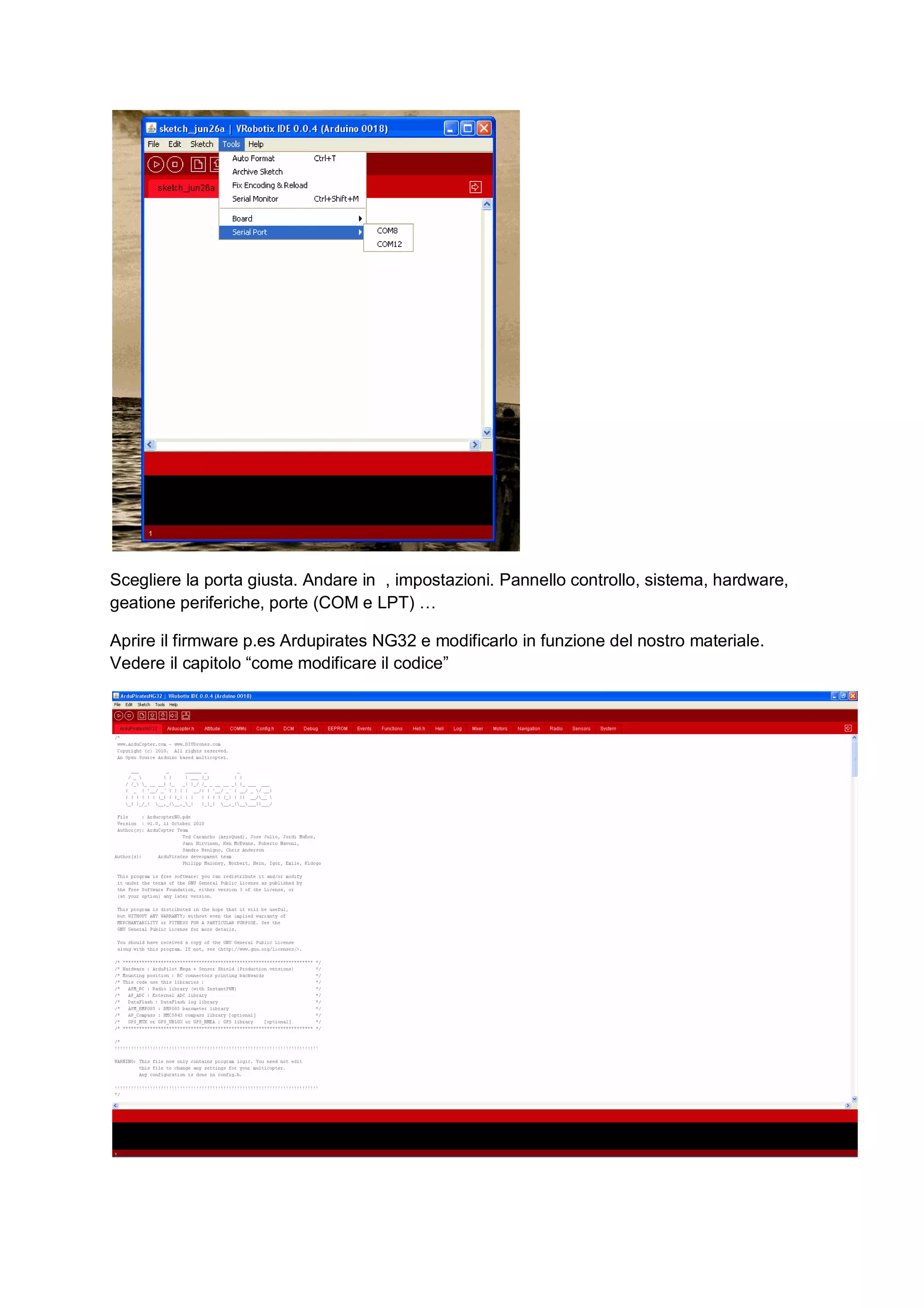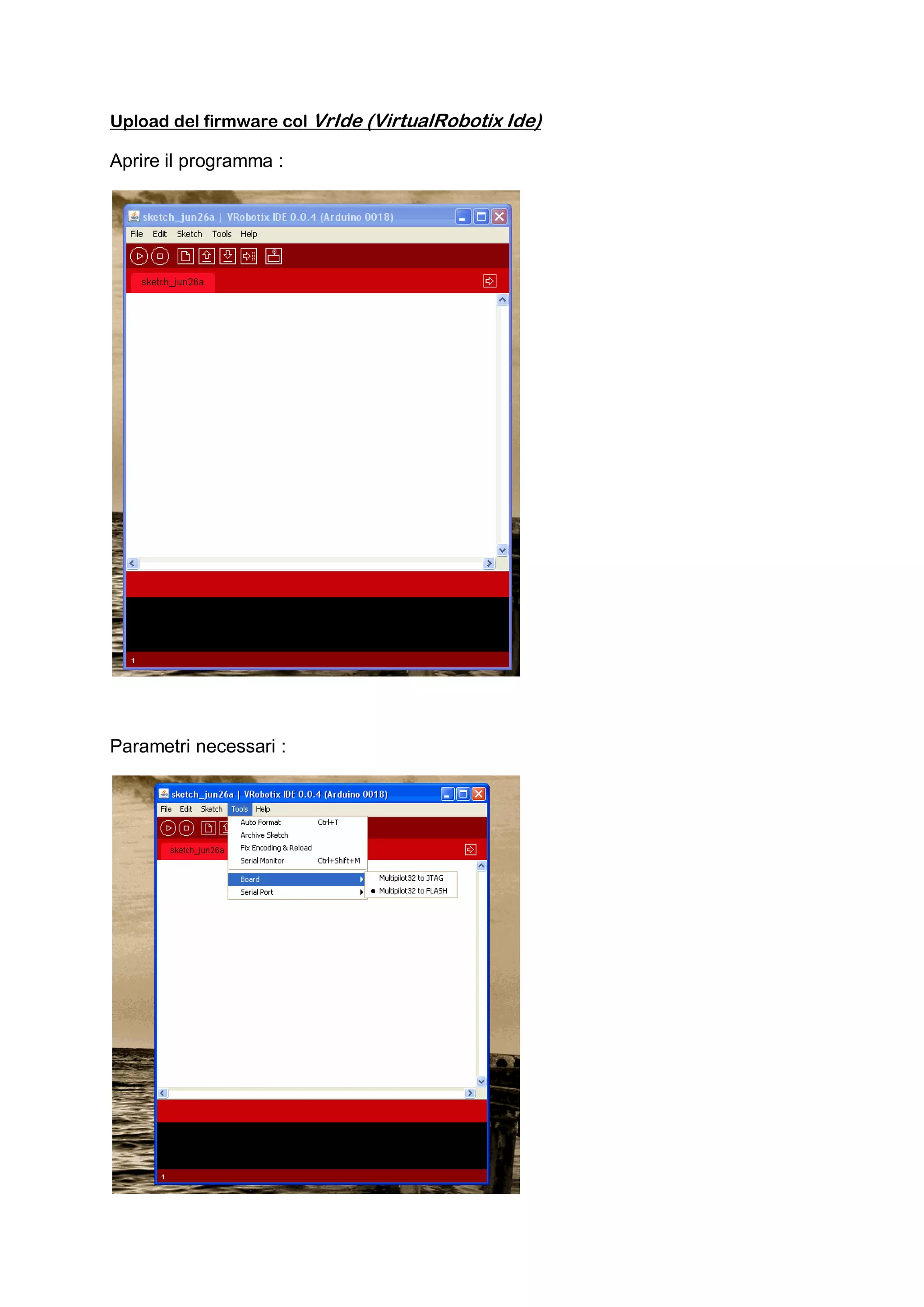 Il documento descrive il processo di upload del firmware utilizzando l'IDE di Virtualrobotix. È necessario selezionare la porta corretta e modificare il firmware per adattarlo al materiale specifico. Dopo aver verificato e compilato il codice senza errori, si può procedere con l'upload.