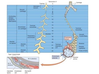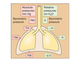 1. Respiration involves gas exchange, host defense, and metabolism. It includes pulmonary ventilation, diffusion of gases between alveoli and blood, and transport of gases through the body.