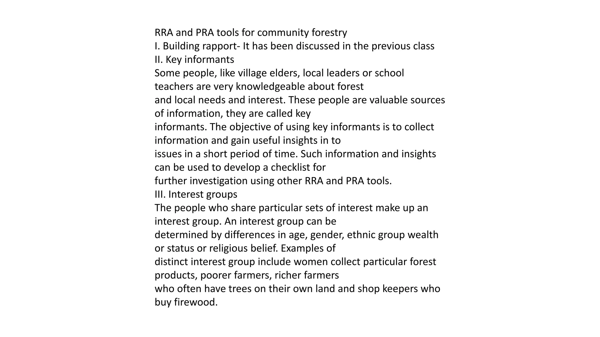 Key informants such as village elders and teachers are valuable sources of information who can provide insights into local forest issues and needs in a short period of time. This information can be used to develop tools to further investigate using RRA and PRA tools. Interest groups are determined by differences in age, gender, ethnicity, wealth, or occupation, such as women collecting forest products or poorer farmers. Assumptions of community forestry include that small-scale local management is better than large-scale, open access can transition to controlled community access, and more human resources are available through local involvement instead of only professionals.