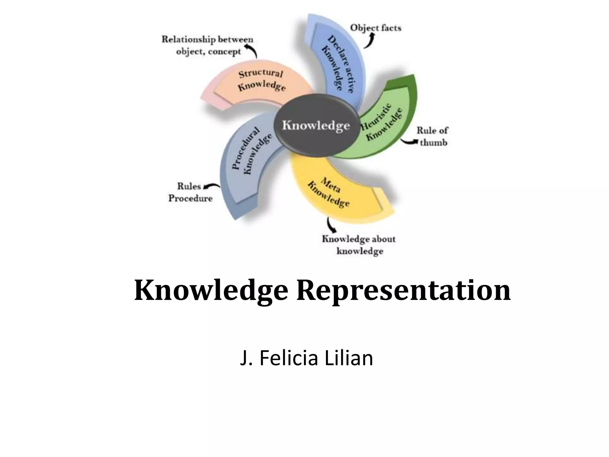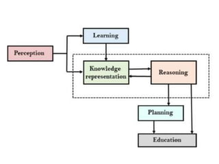 The document discusses different techniques for knowledge representation in artificial intelligence. It describes knowledge representation as allowing machines to understand and utilize knowledge to solve complex problems like human-human communication. It then covers various types of knowledge representation including declarative, procedural, meta-knowledge and more. Finally, it discusses common techniques for knowledge representation such as logical representation, semantic networks, frames, production rules and more.